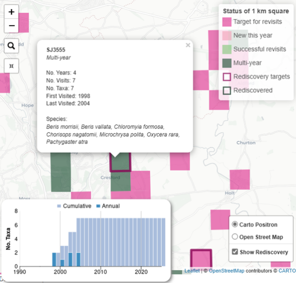 Based on feedback from users, we’ve added the option to view ‘Targets for rediscovery’ in the latest version of the maps (from 2025). Targets for rediscovery are sites that have records of 4+ species but haven’t had records for 10+ years. Records from these sites are especially valuable to understand changes in distribution. Are those species still present? Have new species arrived?