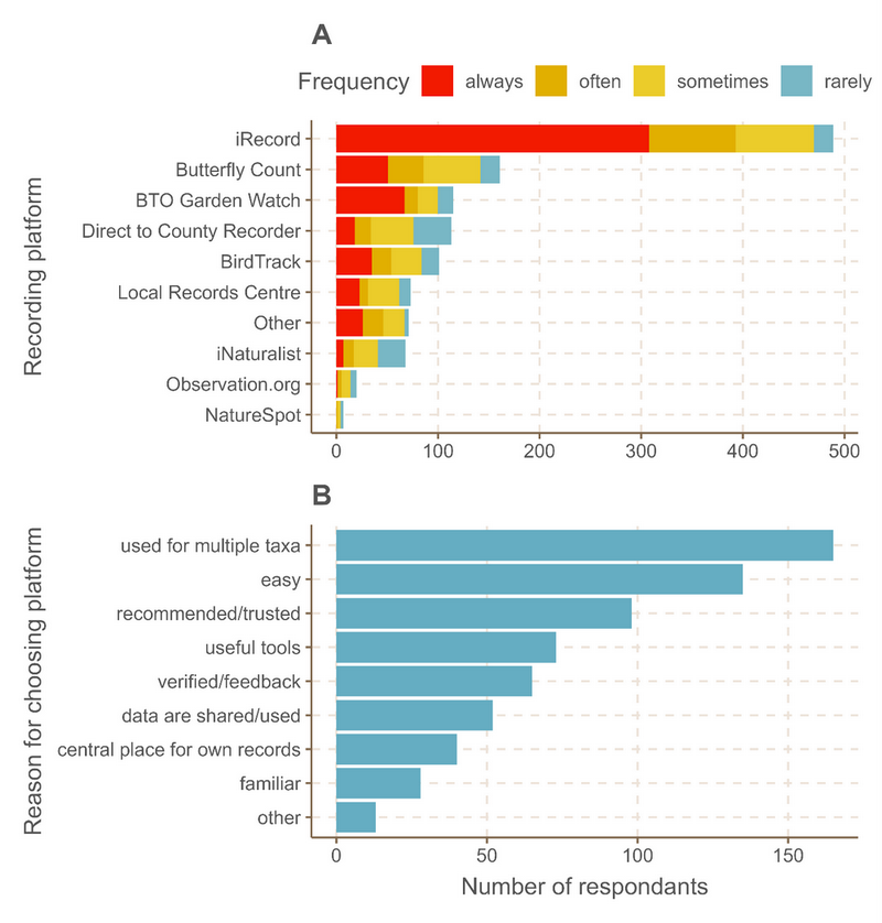 We first asked about platform choices for recording (Fig. 1). iRecord was the most popular platform, but platform choice was determined by multiple factors. Many people mentioned preferring general apps so they can use the same app for different organisms. Others mentioned the importance of simplicity and useful tools (e.g. being able to easily see, upload or download personal observations). Verification of observations was also mentioned by many as important to motivate efforts and choice of platform.