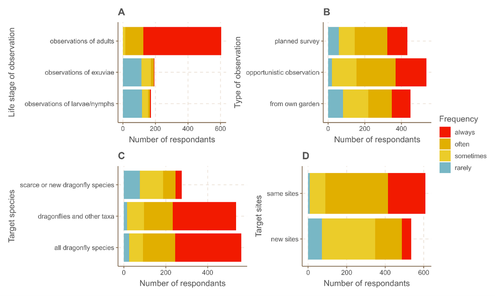 We also asked about general experience and habits of recording (Fig. 2). Most people were confident of identifying species within their local areas, primarily by observing adults. Most people record dragonflies at the same time as other taxa. Observations come from a balanced mix of planned surveys and opportunistic encounters.
