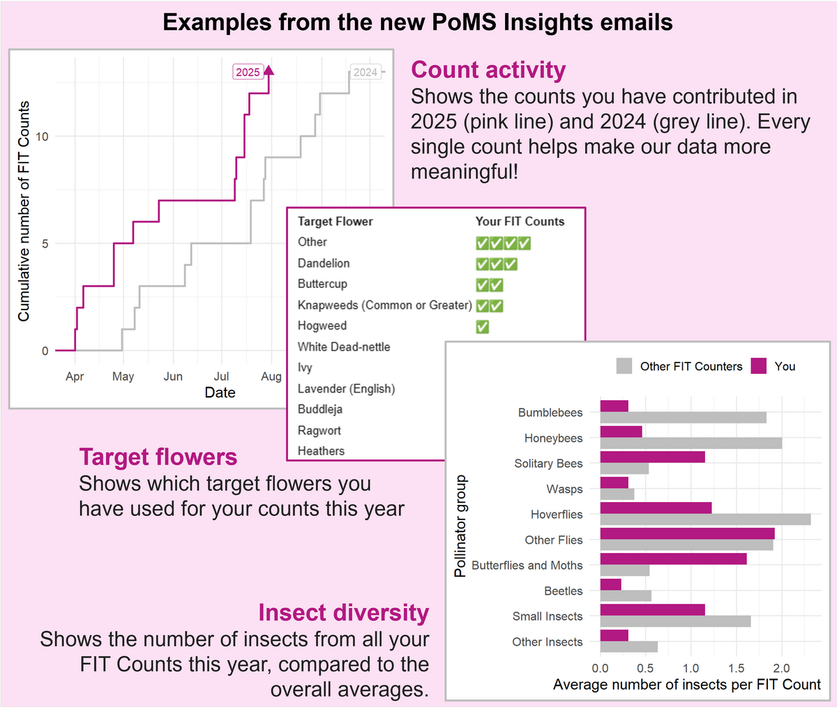 The UK Pollinator Monitoring Scheme (PoMS) has completed another season of pollinator surveys. During the year an Annual Report (covering 2024) was published, along with updated dataset publications. A trial of personalised feedback to survey participants has produced a range of positive feedback, see PoMS Insights.